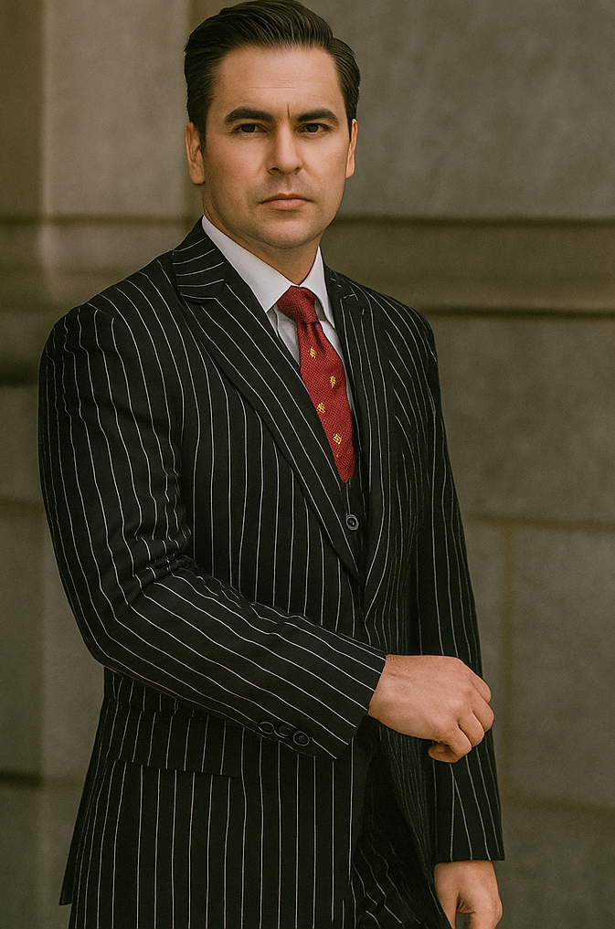 • This classic double breasted suit features a wide bold gangster pinstripe, peak lapel, side vents, and matching pleated pants. This is the perfect suit for any flapper, gangster, 1920's, 1930's, mobster, party, swing dance, or costume party. The suit is construction in a very high quality fabric.