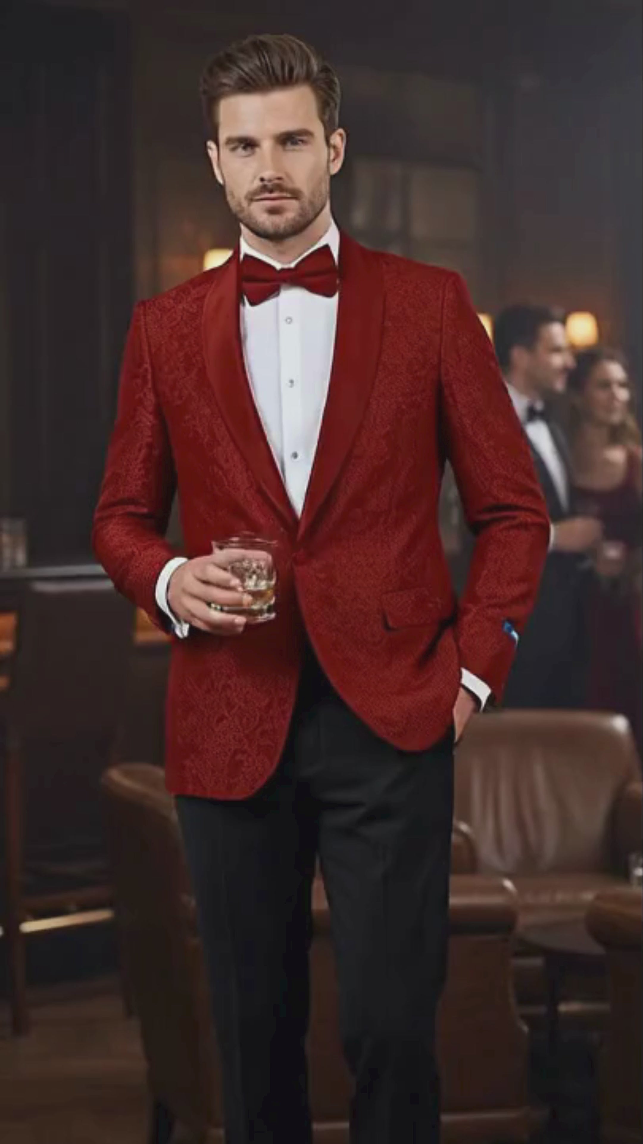 Step into the spotlight with this red paisley tuxedo jacket, the perfect choice for men who want to stand out with sophistication and bold elegance.