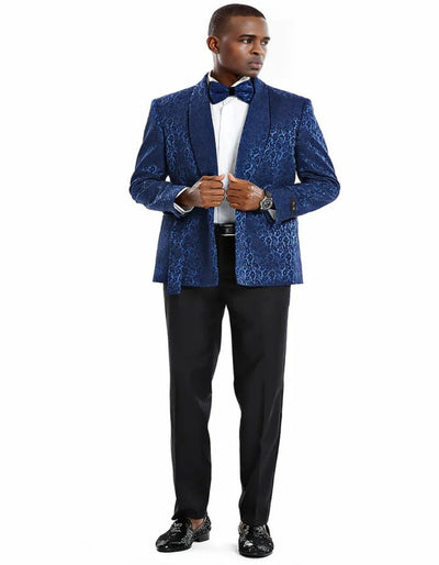 Blue Wedding Tuxedo - Men's Slim Fit Double Breasted Navy Blue Paisley Prom Smoking Jacket
