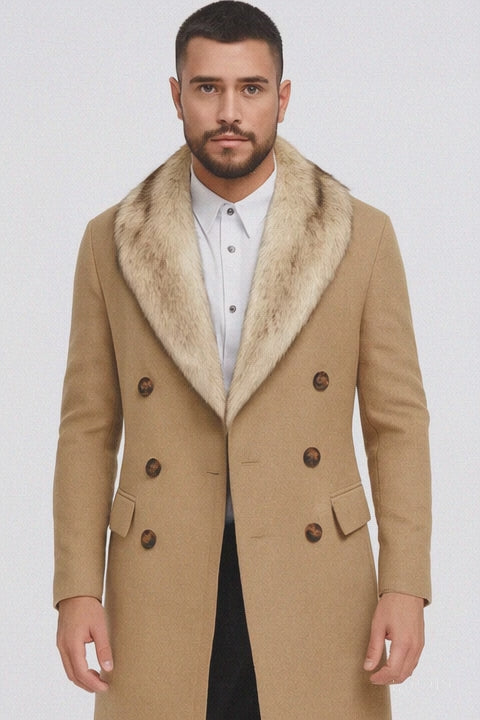 Men’s Camel Hair Overcoat – Double-Breasted Wool & Cashmere Peacoat with Fur Collar