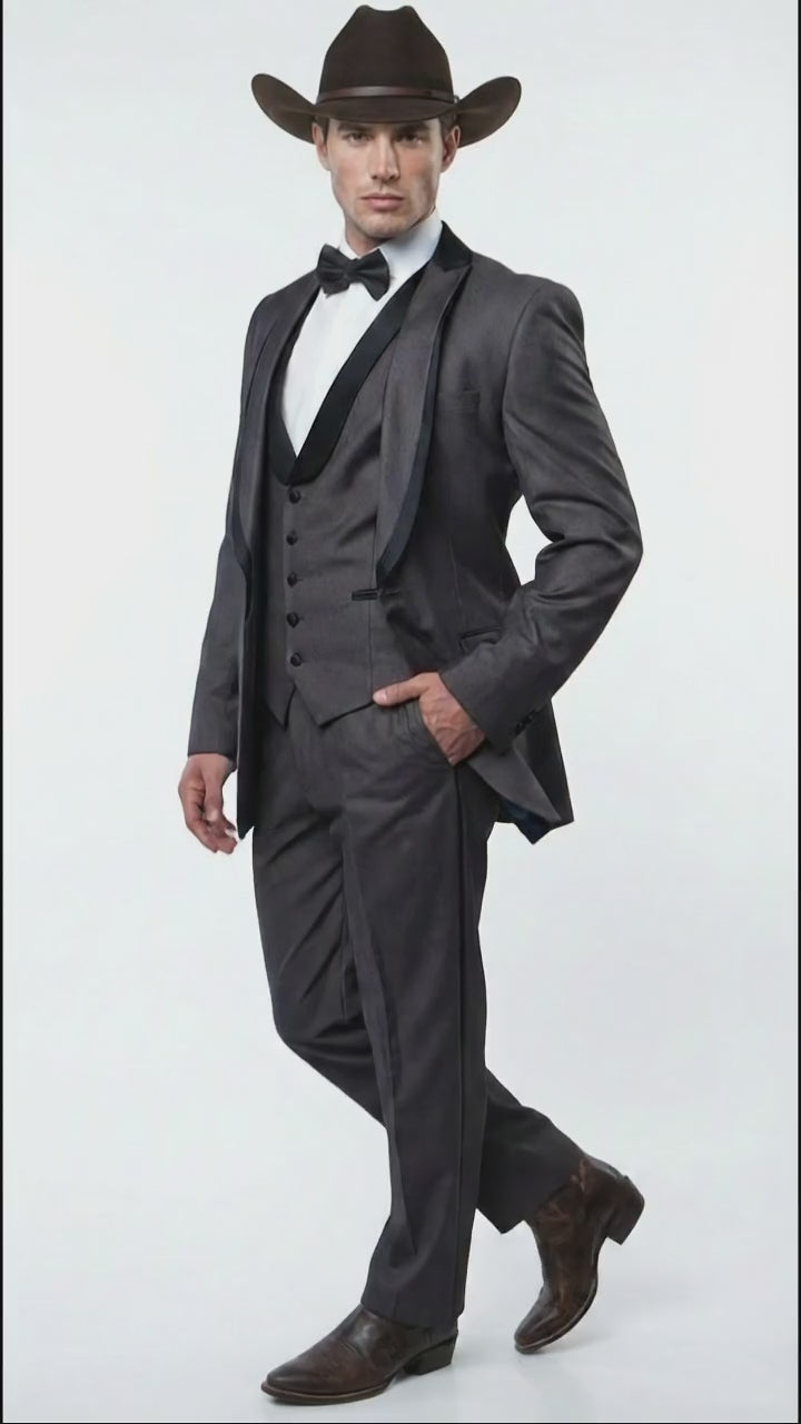 Step into refined elegance with this charcoal gray western tuxedo for men, designed for classic formal and evening wear. This sophisticated three piece tuxedo includes a tailored jacket with smooth satin lapels, a matching vest, and coordinated trousers, delivering a polished and confident formal appearance.