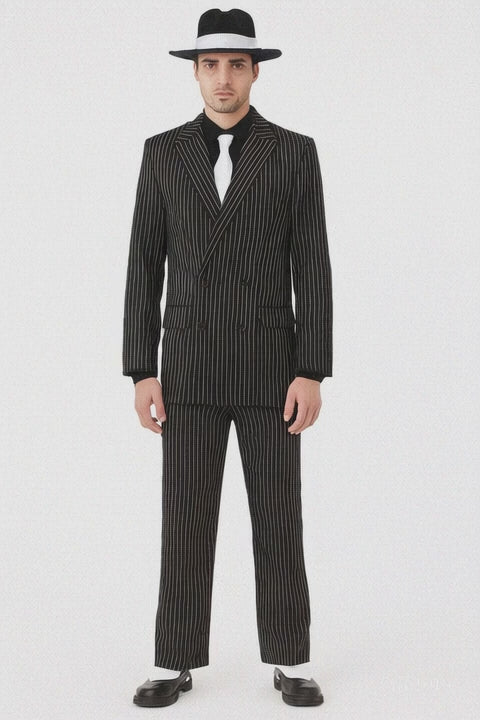 This bold double-breasted suit channels the iconic 1920s–40s gangster style, featuring jet-black fabric with crisp white pinstripes. The wide peak lapels, structured shoulders, and tailored fit deliver a sharp, powerful silhouette. Designed as a fashion-forward take on a vintage classic, it blends old-school charisma with modern tailoring.