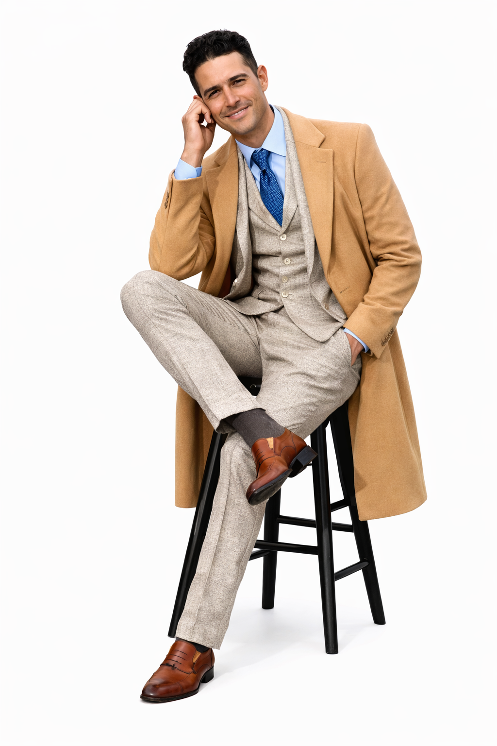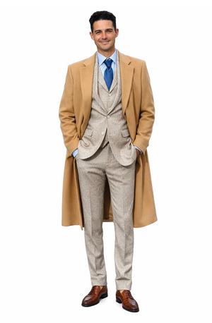 Make a statement with this elegant Men's Camel Overcoat paired with a Beige Tweed 3-Piece Suit, a refined ensemble perfect for weddings, winter events, and formal gatherings. This sophisticated outfit combines classic British tailoring with modern luxury, offering a balanced blend of warmth and style.