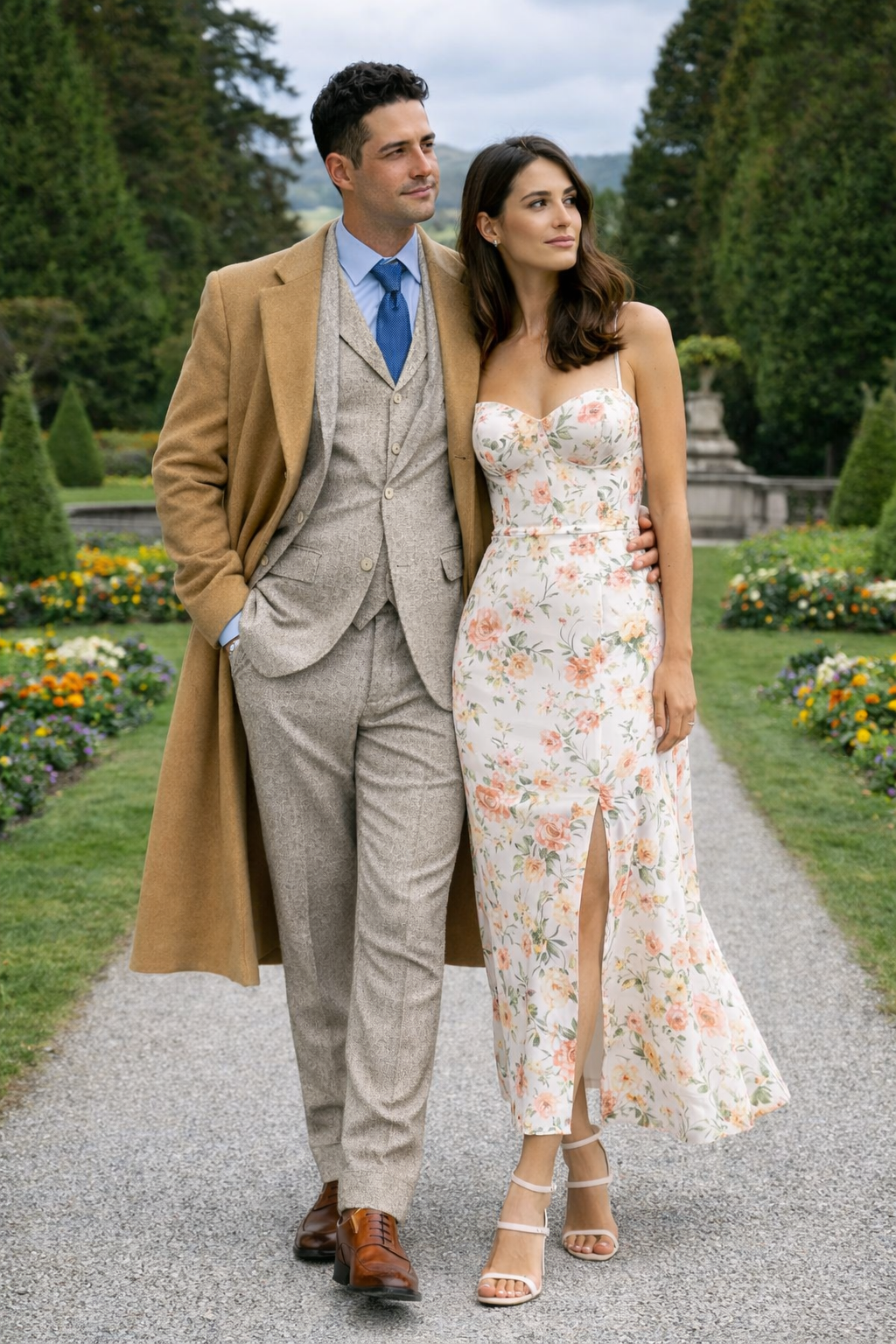 The full-length camel overcoat features a clean, structured design, crafted to provide insulation without compromising on elegance. Underneath, the tailored beige tweed suit includes a single-breasted blazer, a matching waistcoat, and slim-fit trousers made from textured tweed for a timeless heritage look.