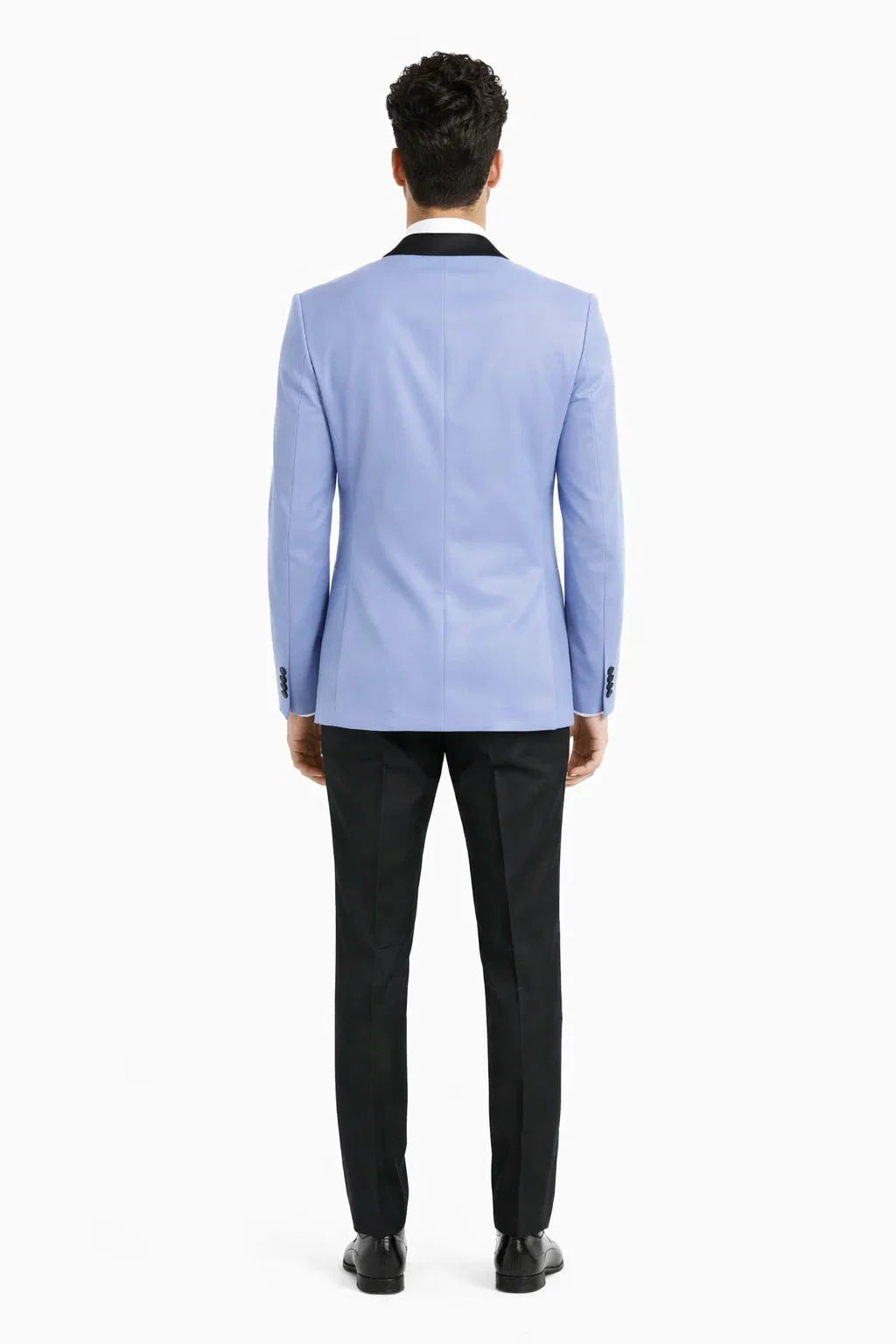 An elegant tuxedo with a modern edge. The sky blue shade photographs beautifully, and the satin trim adds just the right amount of sophistication. Comfortable, stylish, and perfect for special occasions. — Trevor N.