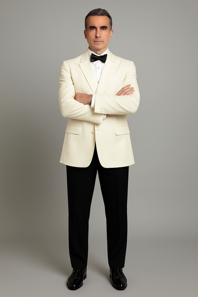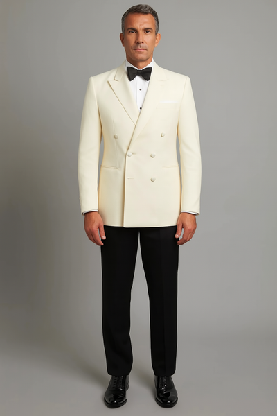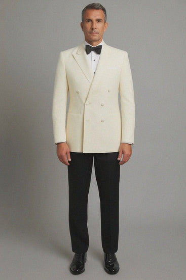 Step into timeless elegance with our Ivory Double Breasted Tuxedo Dinner Jacket. Expertly tailored in a refined off-white tone, this cream tuxedo jacket exudes sophistication and modern charm. Featuring a classic double-breasted front, sharp peak lapels, and a crisp silhouette, it's perfect for formal dinners, weddings, and black-tie affairs.