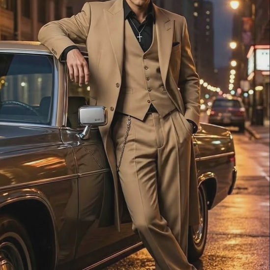 Mens 1920s Beige Zoot Suit Long Mafia Gangster Three-Piece Suit in Tan Khaki Color 40 inch Zuit Pachuco Suit