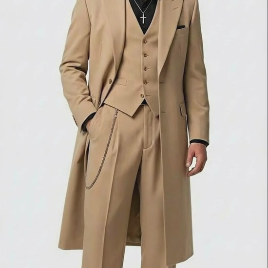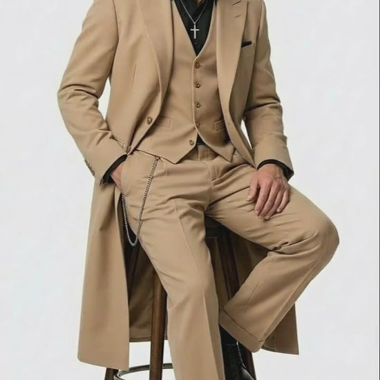 Crafted for standout presence, this suit combines sharp tailoring with a full-length coat that adds dramatic movement and period-correct authenticity. The coordinated three-piece design provides a refined, structured fit, while the beige color delivers a clean, timeless look suitable for themed events, performances, weddings, or modern fashion statements.