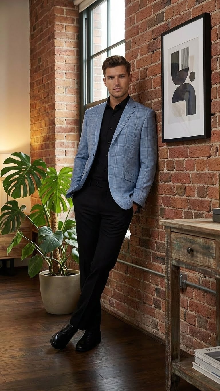 The elegant light blue color with subtle checks adds a sophisticated touch while remaining versatile and easy to style. Perfect for wedding ceremonies, engagement events, daytime parties, corporate functions, and formal gatherings, this blazer pairs effortlessly with dress shirts, trousers, and formal footwear.