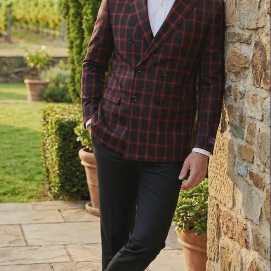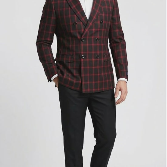 Men’s Black and Red Check Double Breasted Blazer – Sport Coat Jacket Windowpane Sportcoat Slim Fit