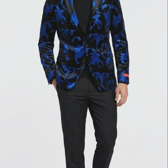 Men’s Black and Royal Blue Patterned Blazer – Paisley Floral Sport Coat Prom Jacket