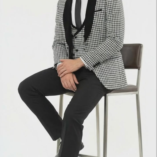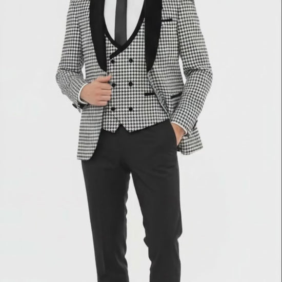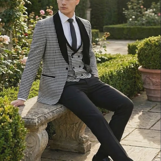 Mens Black and White Houndstooth Tuxedo Set with Velvet Shawl Lapel | 3-Piece Formal Suit with Double-Breasted Vest