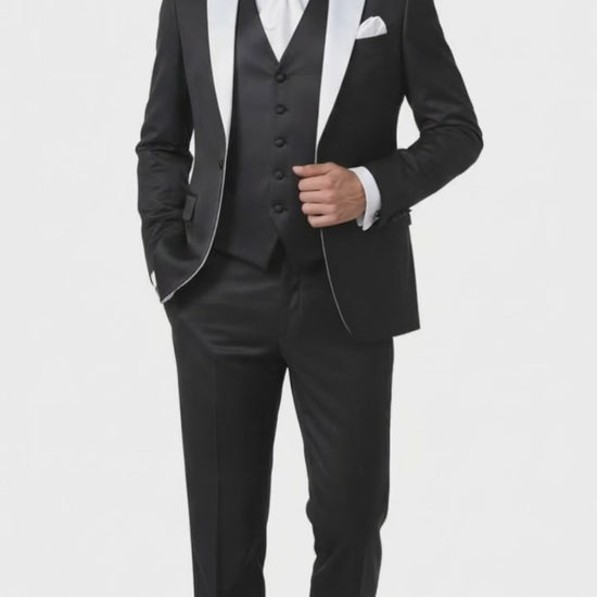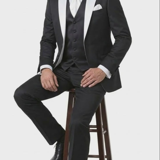 Mens Black and White Lapel Prom Tuxedo Suit Black Vest Black Pants Peak Lapel