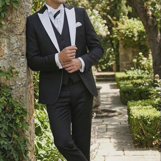 - Classic black color with contrasting white peak lapel