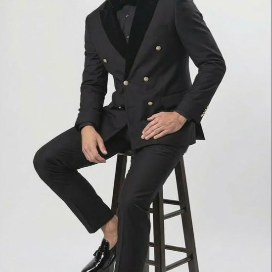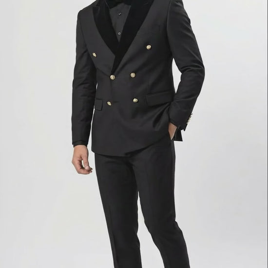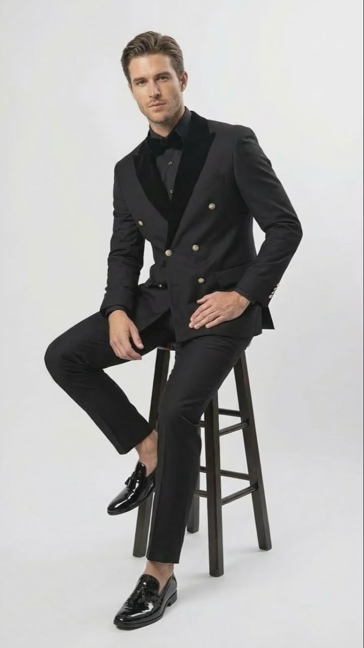 Mens Black Double Breasted Tuxedo Suit Luxury Formal Dinner Jacket Gold Buttons Velvet Lapel