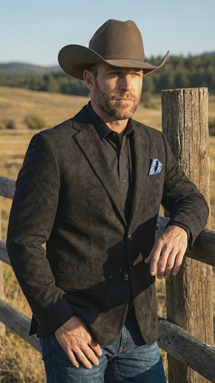 Black suede cowboy blazer featuring a classic western inspired design with premium suede fabric and stylish elbow patch sleeves, perfect for casual outfits, western fashion, and modern smart casual style.