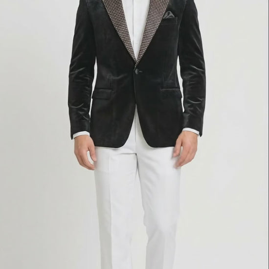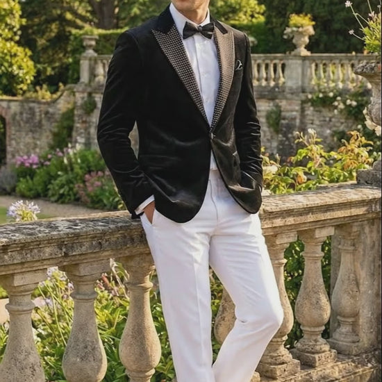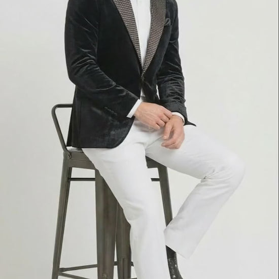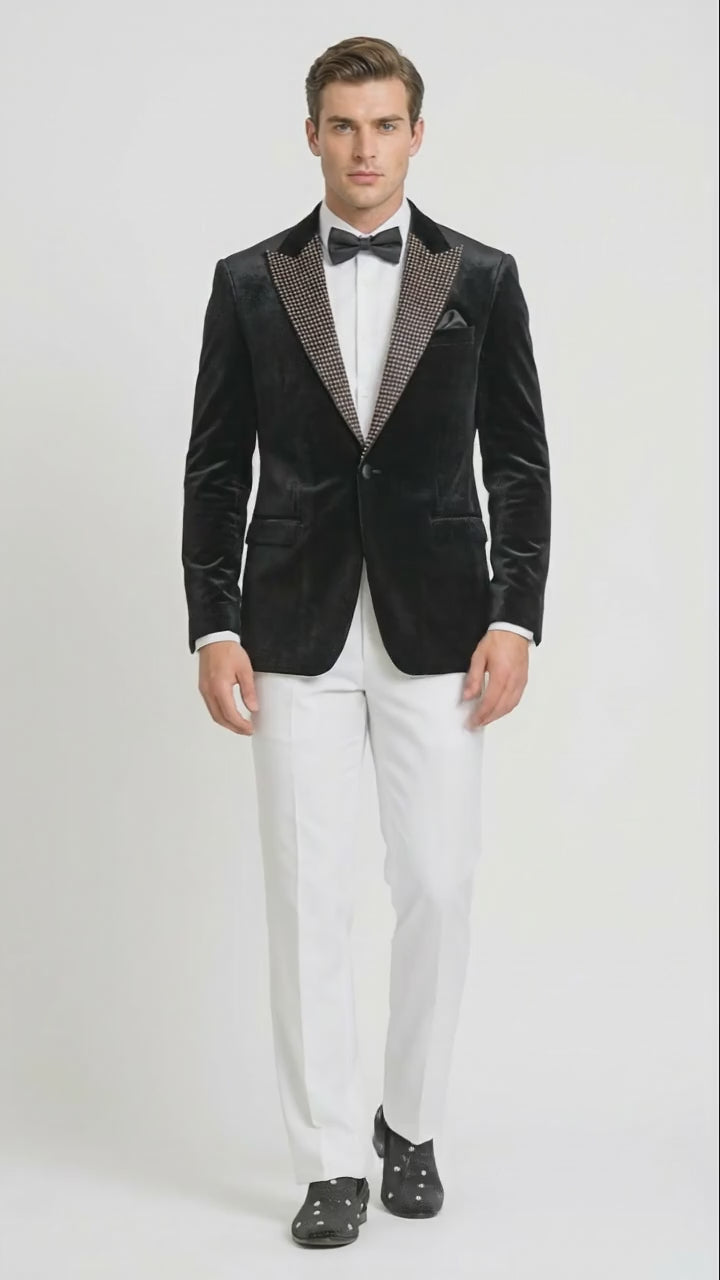Mens Black Velvet Tuxedo Blazer with Studded Lapel Formal Evening Jacket