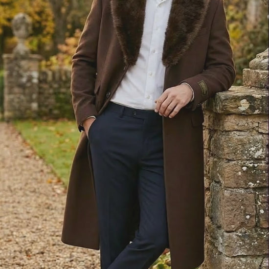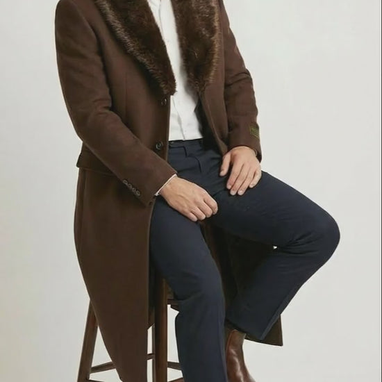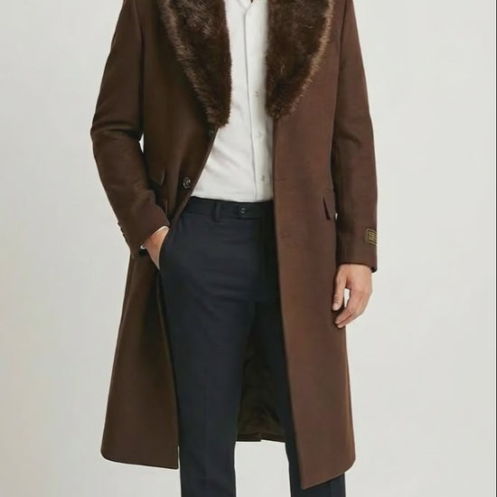 Mens Brown Long Overcoat with Faux Fur Collar Classic Winter Formal Coat Three Quarter Carcoat Wool and Cashmere Fabric