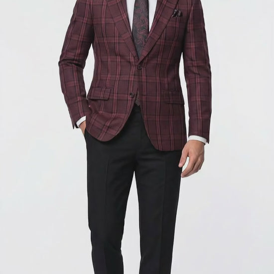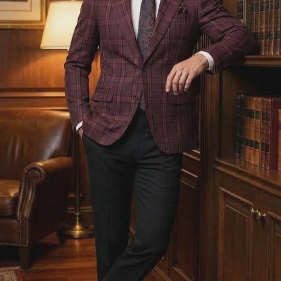 A perfect choice for grooms, wedding guests, and men seeking standout party and formal wear, this burgundy check blazer is a strong addition to any modern wardrobe.