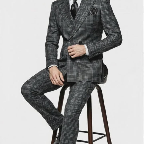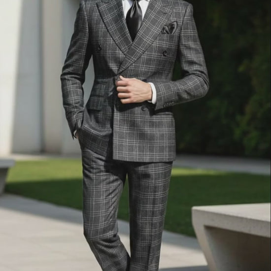 Charcoal plaid double-breasted jacket with matching tailored trousers