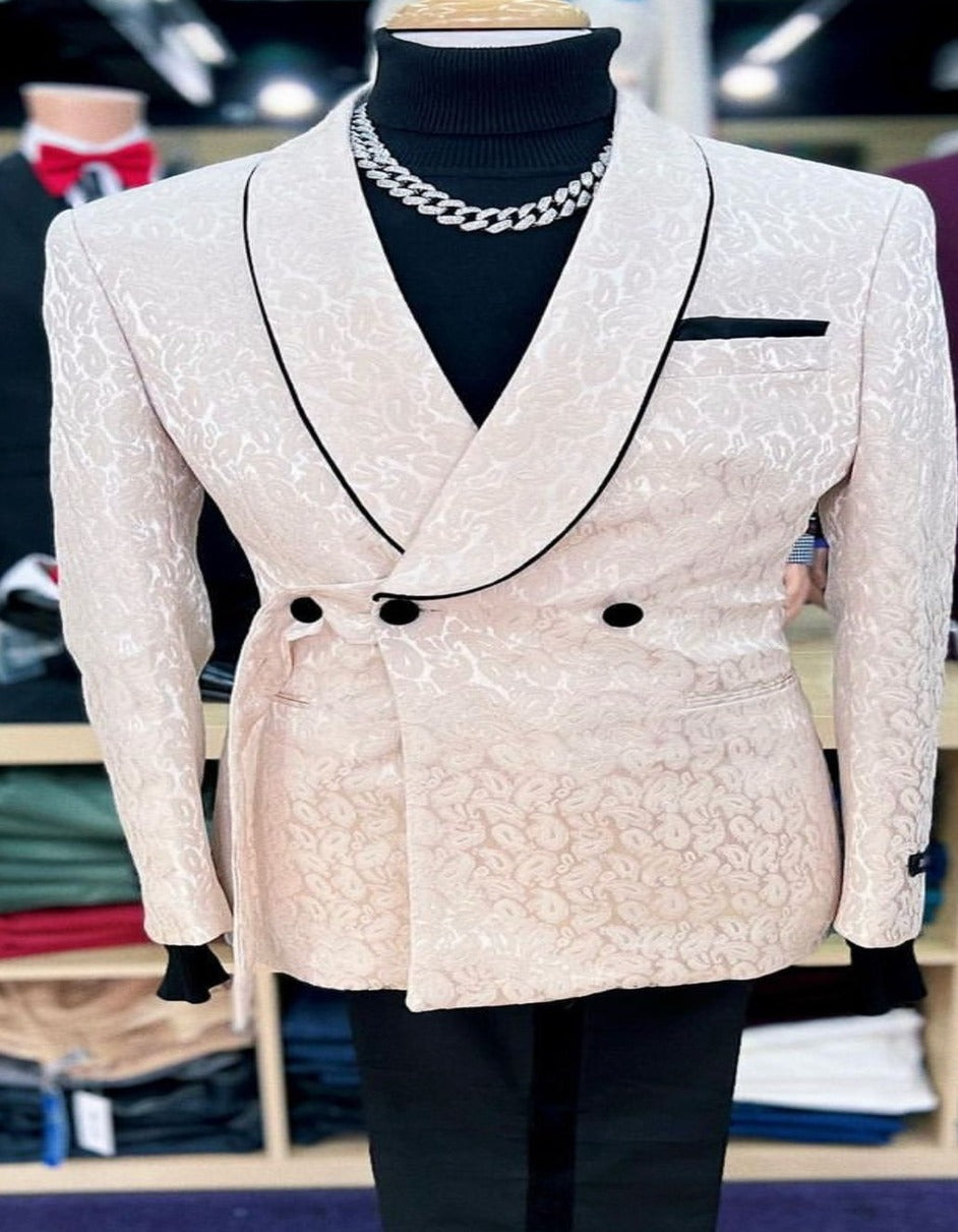Mens Cream Jacquard Double-Breasted Tuxedo with Black Trim Formal Blazer for Weddings & Events Ivory Color