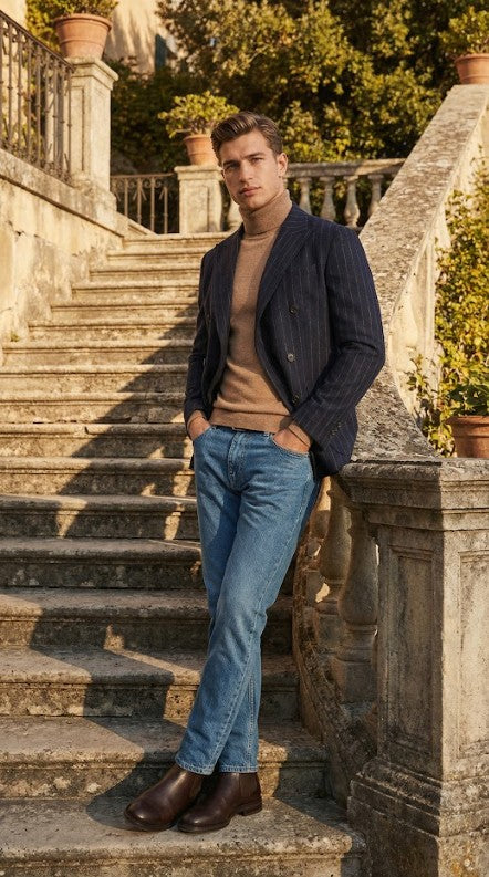 This men’s double breasted navy pinstripe blazer is a versatile and timeless addition to any wardrobe, combining professional appeal with modern style.