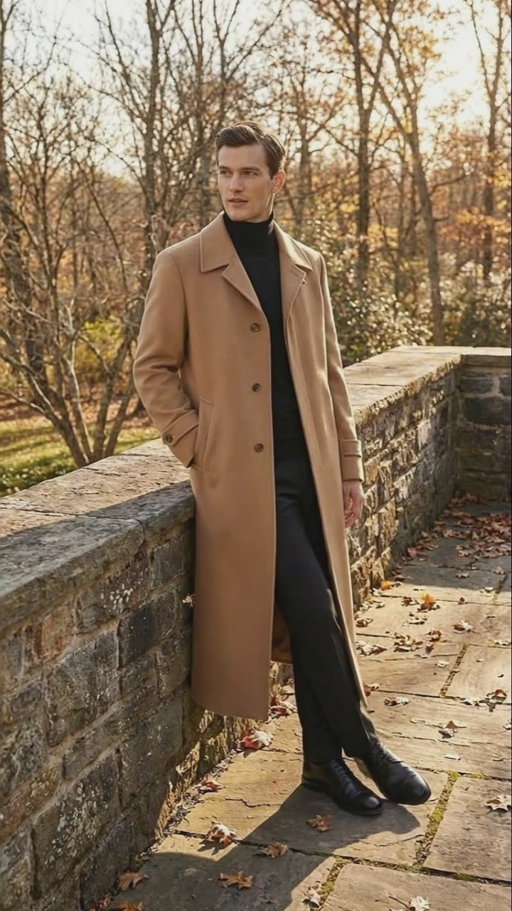 Mens Full-Length Camel Overcoat Classic Long Microfiber-Blend Coat for Winter and Formal Wear Maxi Duster Coat