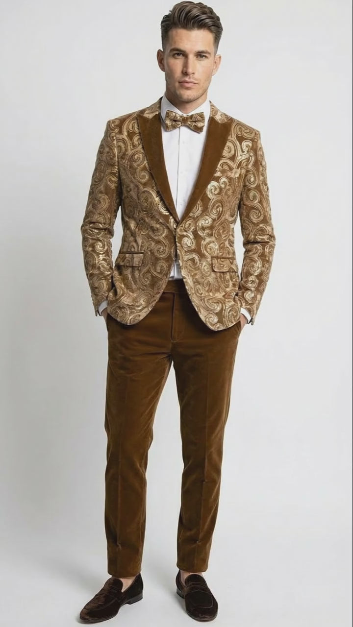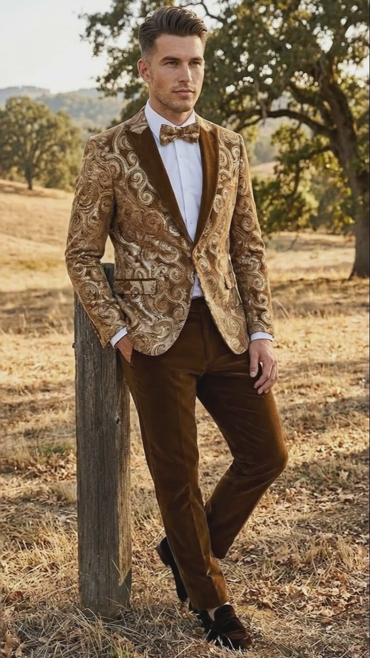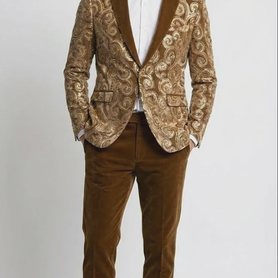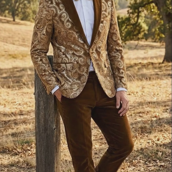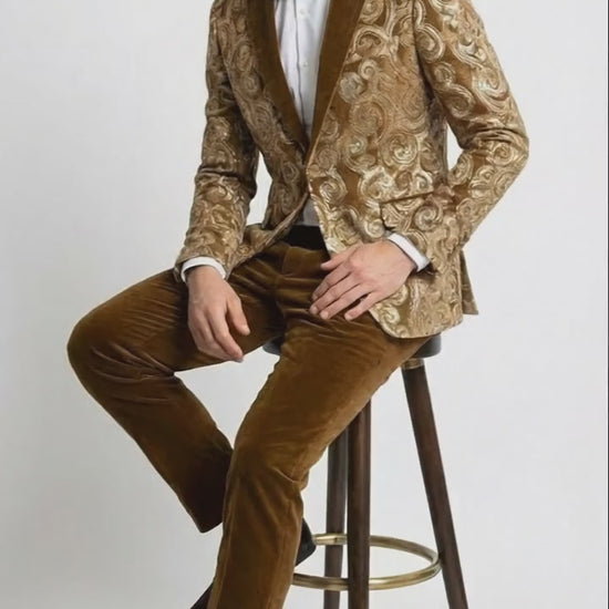 Mens Goldish Light brown Tuxedo dinner Jacket Embroidered Blazer Velvet Jacket for Formal Paisley Pattern Coffee Mocca Color