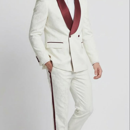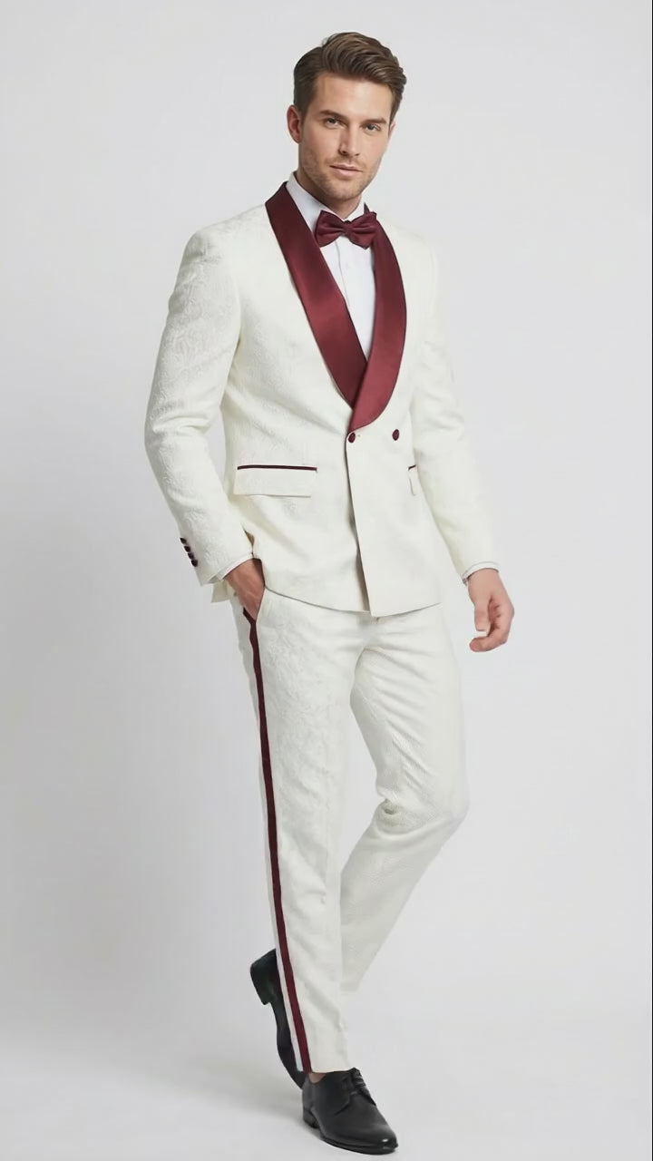 Mens Ivory and Burgundy Jacquard Tuxedo Suit Luxury Slim Fit 3-Piece Formal Wedding, Prom, and Gala Outfit in Cream Off White Color