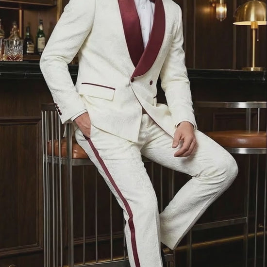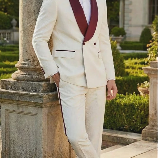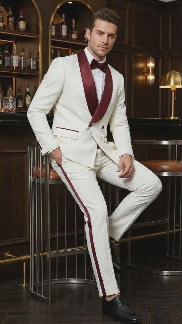 Step into timeless elegance with this men’s ivory and burgundy jacquard tuxedo suit, designed for upscale events where sophistication is essential. Made from premium jacquard fabric, this tuxedo showcases a refined textured pattern that adds depth and luxury to the ensemble. The clean ivory base paired with a rich burgundy satin shawl lapel creates a bold and distinguished contrast, perfect for weddings, proms, formal dinners, and gala celebrations.