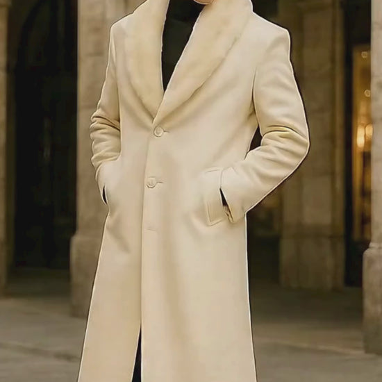 Mens Ivory Full-Length Overcoat with Luxurious Faux Fur Shawl Collar Winter Dress Coat