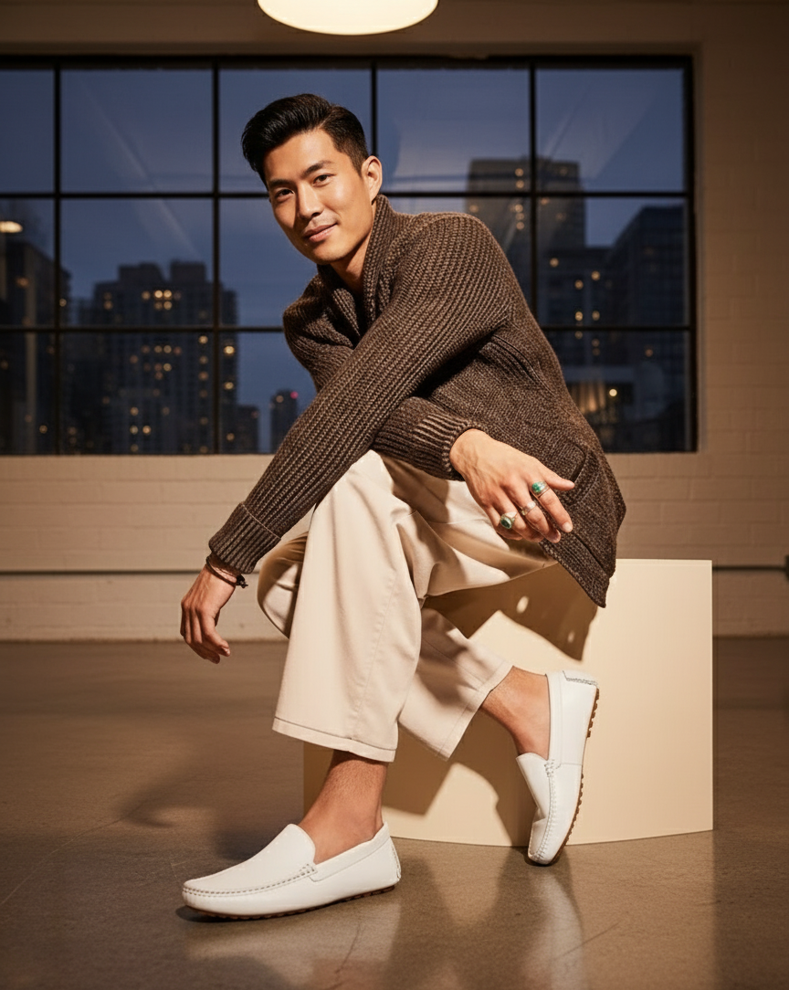 These white leather loafers bring together timeless craftsmanship and modern appeal. Lightweight, breathable, and easy to wear, they’re the ideal choice for men who appreciate smart, versatile footwear that complements any outfit.