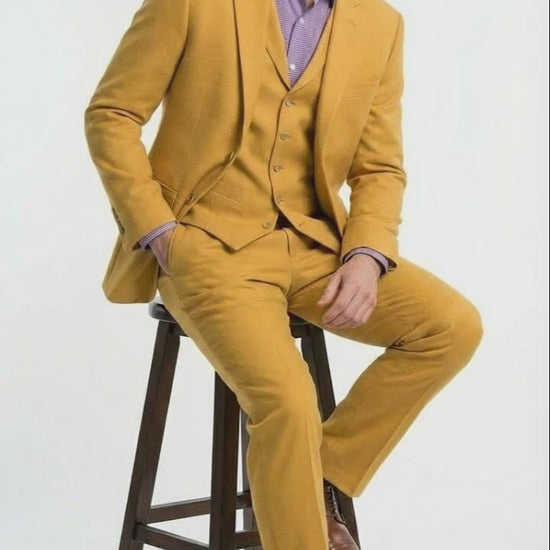 This mustard yellow three piece suit is perfect for men who want a bold yet refined look while maintaining a professional and stylish presence. Pair it with a dress shirt and formal shoes to complete a distinctive and fashionable outfit.