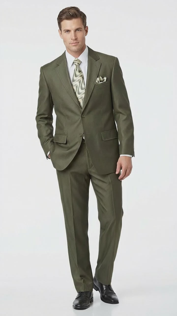 This formal tuxedo suit features a structured jacket and matching trousers that create a polished and balanced silhouette. The elegant olive green tone offers a stylish alternative to traditional black tuxedos, making it ideal for weddings, evening receptions, prom events, and upscale celebrations.
