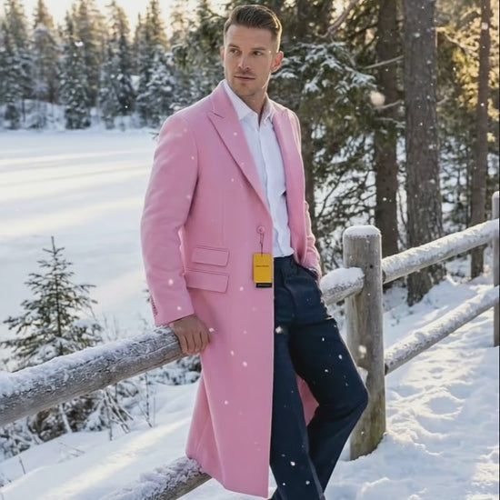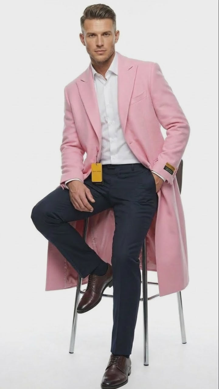 Make a bold and refined statement with this Men’s Pink Wool Blend Long Overcoat, crafted for modern style and seasonal comfort. The soft pink tone delivers a standout look while maintaining a clean, sophisticated appearance suitable for both formal and fashion-forward styling.