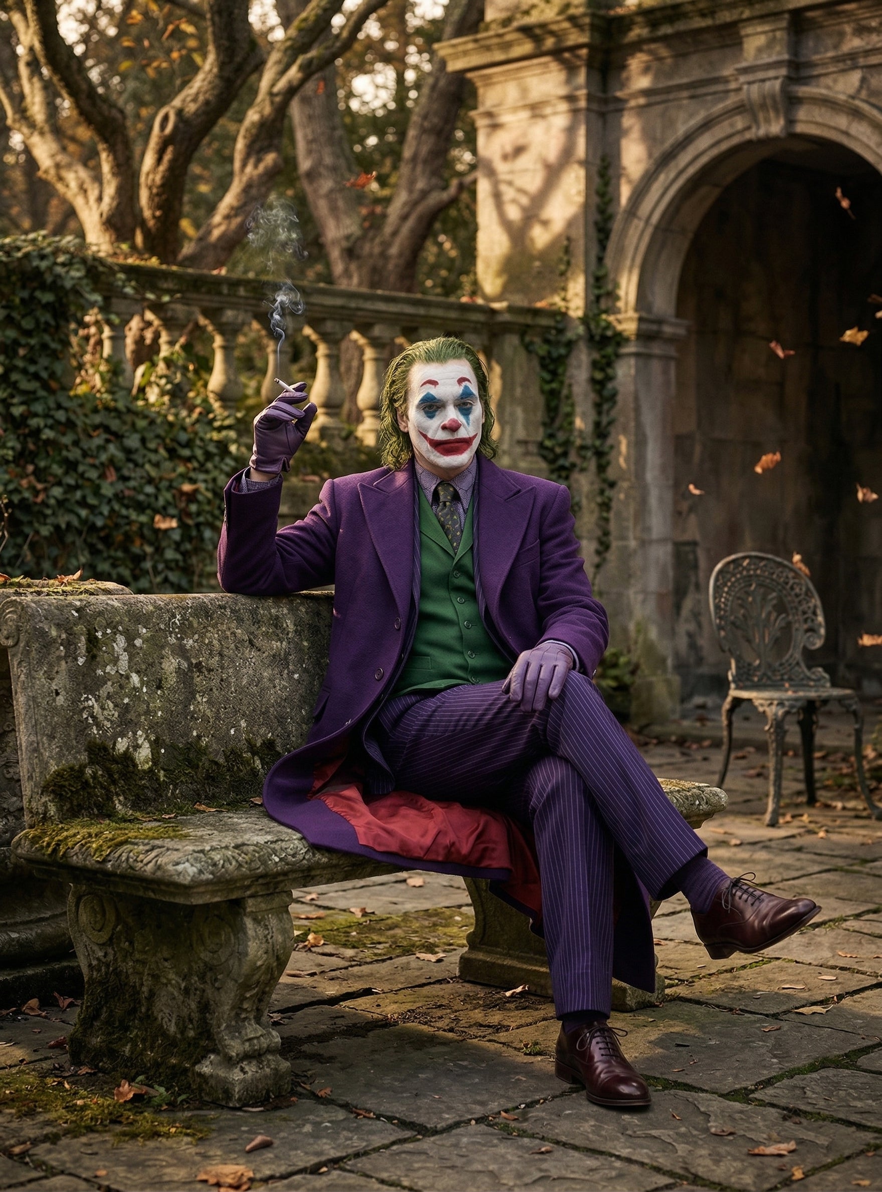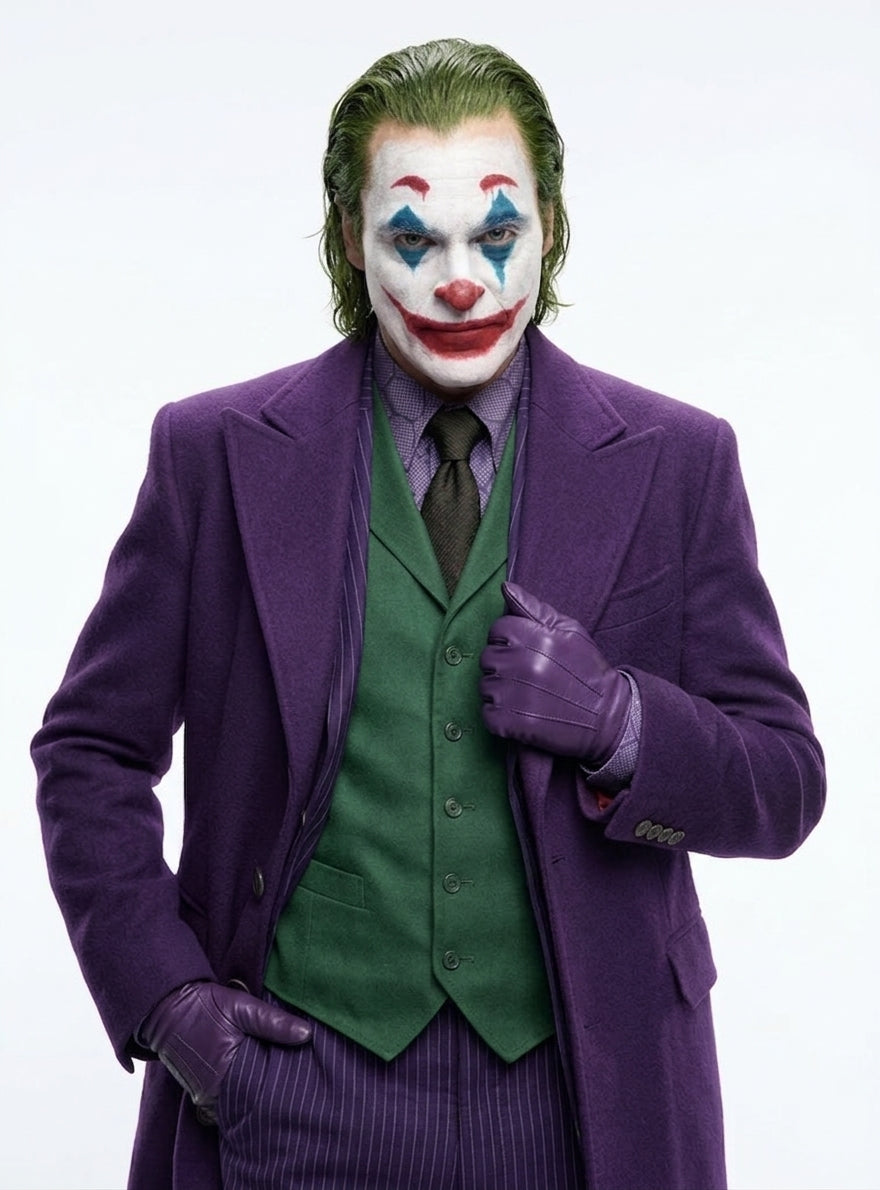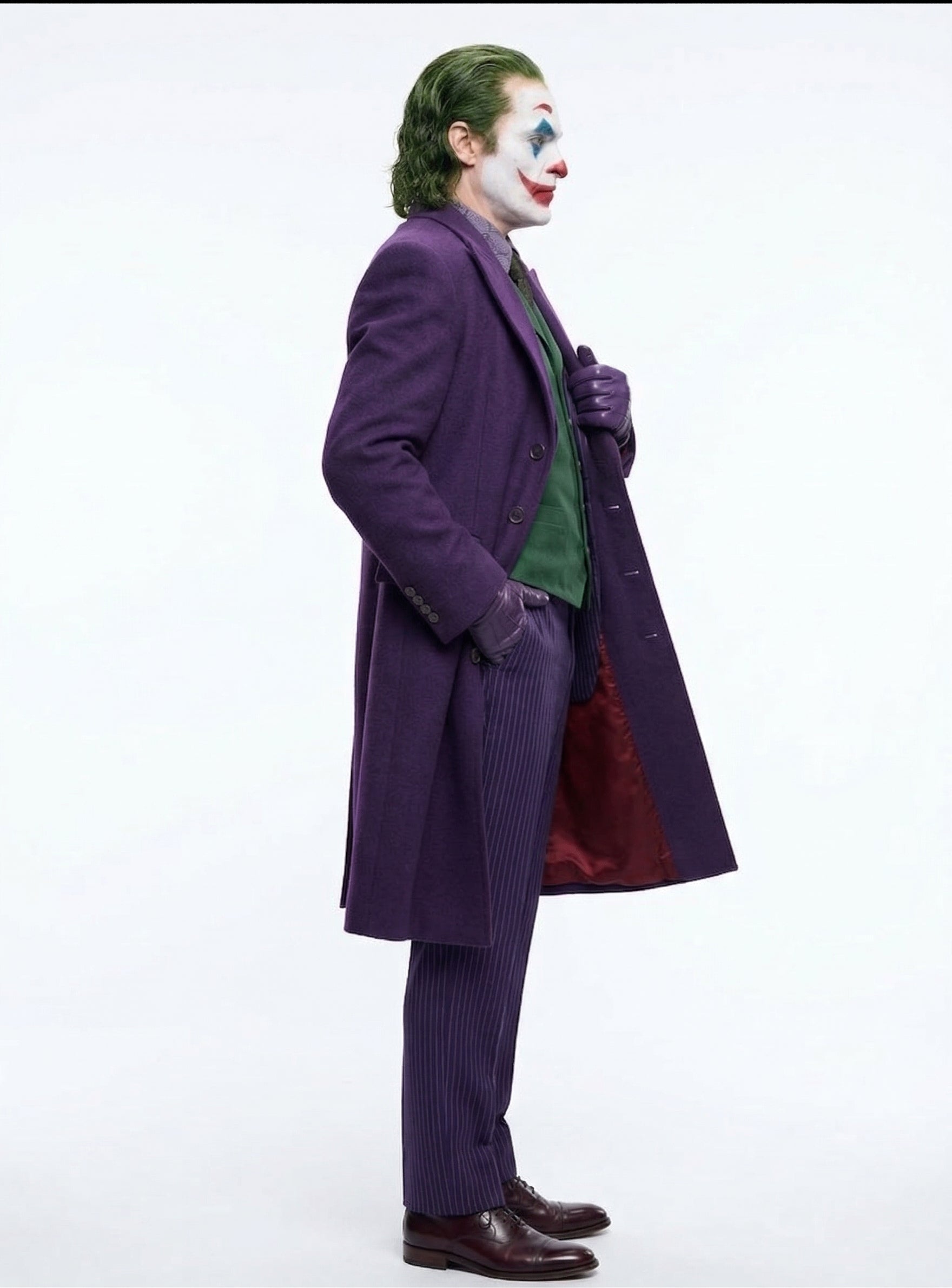 Make a striking impression with this men’s purple overcoat inspired by joker-folie-a-deux-arthur-