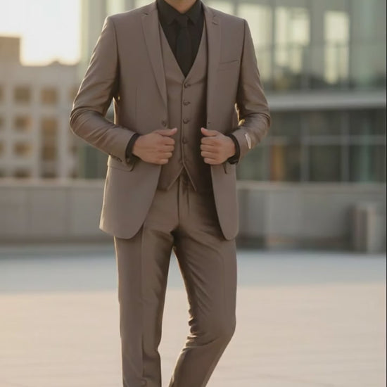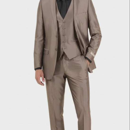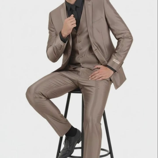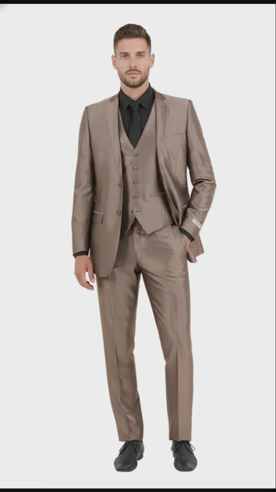 Mens Sateen Shiny Metallic Mocca Taupe Gold Bronze 3-Piece Suit Set Shiny Finish slim Fit Formal and Party Suit