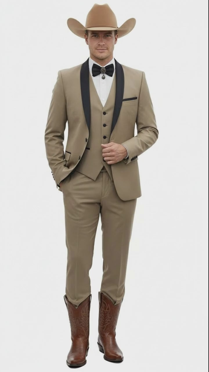 Men’s Western Cowboy Suit – 3-Piece Tan Tuxedo with Black Lapel, Vest, and Pants Beige Color