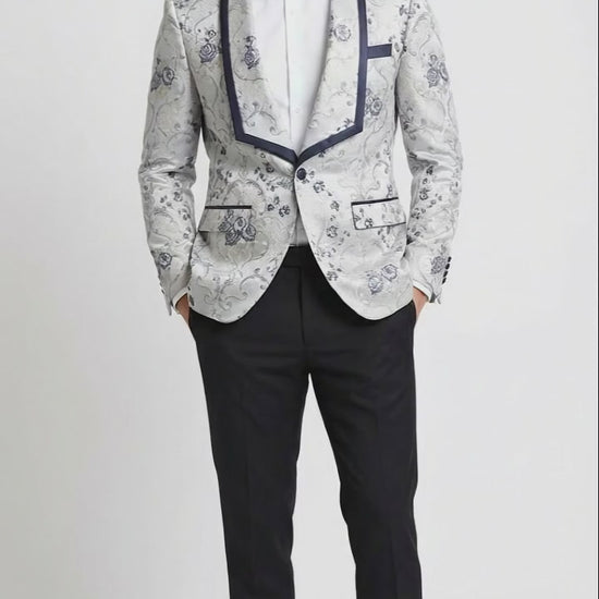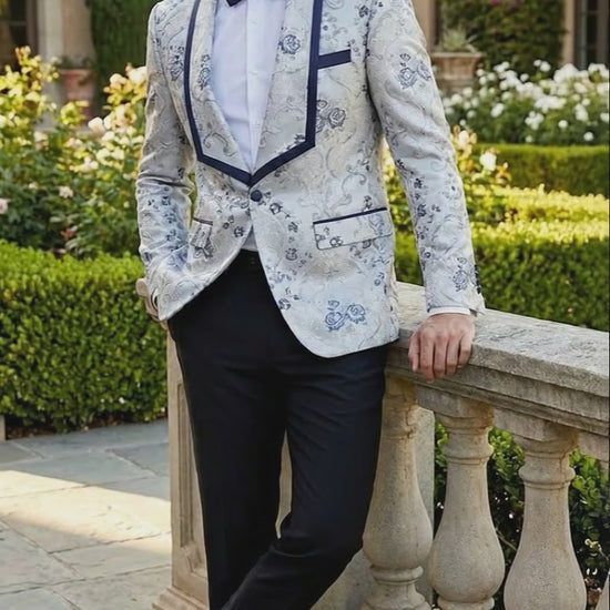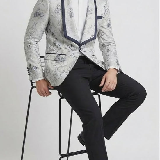 Mens White and Navy Blue Lapel Floral Jacquard Blazer with Contrast Shawl Lapel Luxury Wedding and Party Wear Jacket paisley Tuxedo Navy Pants