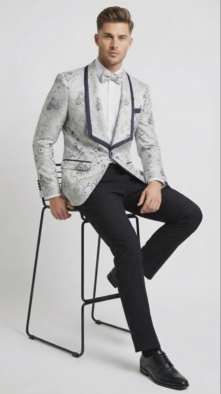 Make a refined statement with this Men’s White and Navy blue laepl tuxedo Floral Jacquard Blazer, designed for premium formal and celebration wear. Featuring an elegant ivory base with intricate floral jacquard detailing, this blazer delivers a sophisticated and luxurious look suitable for high-end occasions.