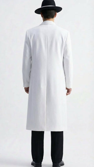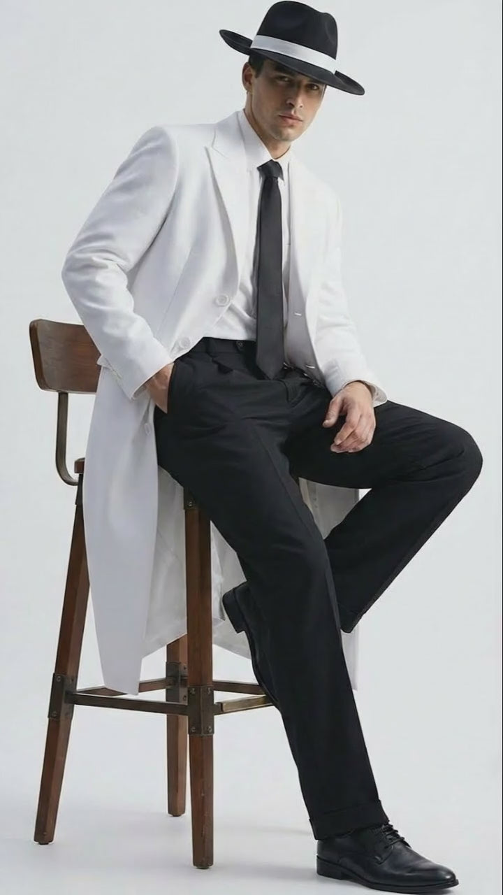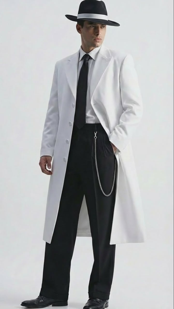 The crisp white color creates a striking contrast against black trousers, delivering a sharp and commanding look. Featuring a long length cut, structured shoulders, button-front closure, and a tailored fit, this white zoot-style coat reflects classic gangster and mafia-inspired fashion with modern craftsmanship. The design offers both style and comfort while maintaining an authentic vintage aesthetic.
