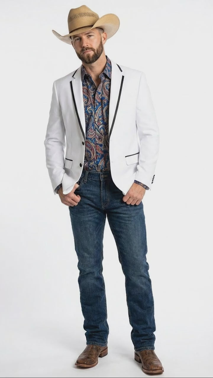 Men’s White Western Blazer with Black Trim – Classic Cowboy Style