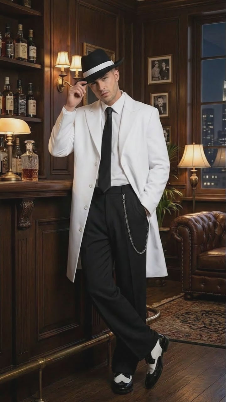 The crisp white color creates a striking contrast with the black pants, making this zoot suit ideal for themed parties, stage performances, costume events, nightlife occasions, and statement fashion looks. The long coat design reflects authentic gangster and mafia styling, offering a confident silhouette with dramatic presence.