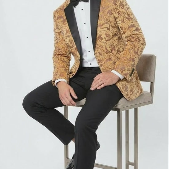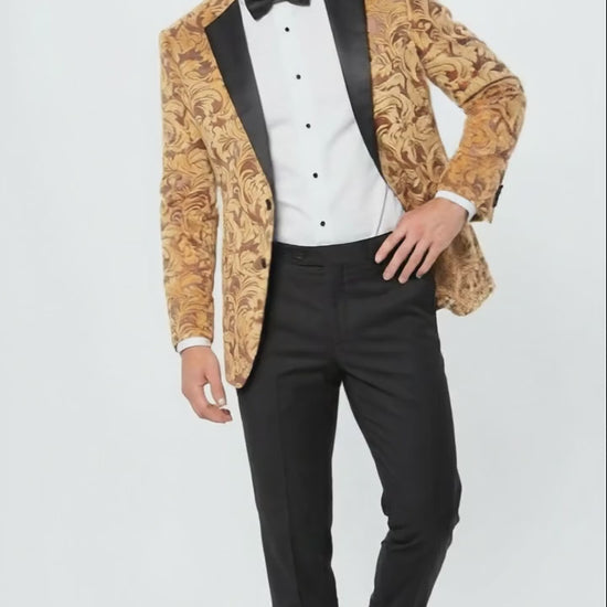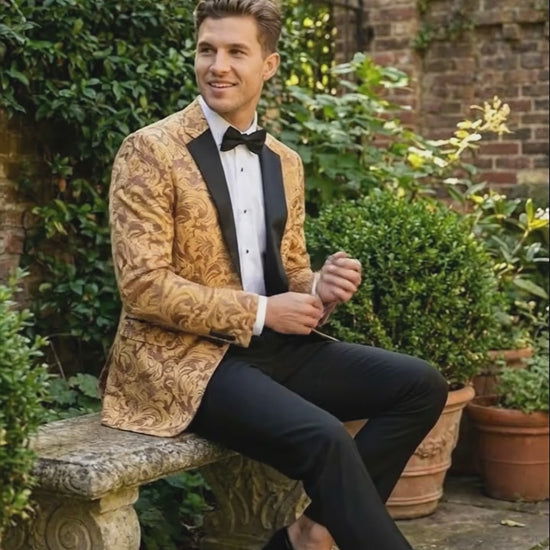 Elevate your formal style with this Men’s Gold Paisley Baroque Pattern Tuxedo Blazer, designed for statement-making elegance. Featuring an intricate gold baroque-inspired pattern, this blazer delivers a rich and sophisticated look ideal for premium occasions.