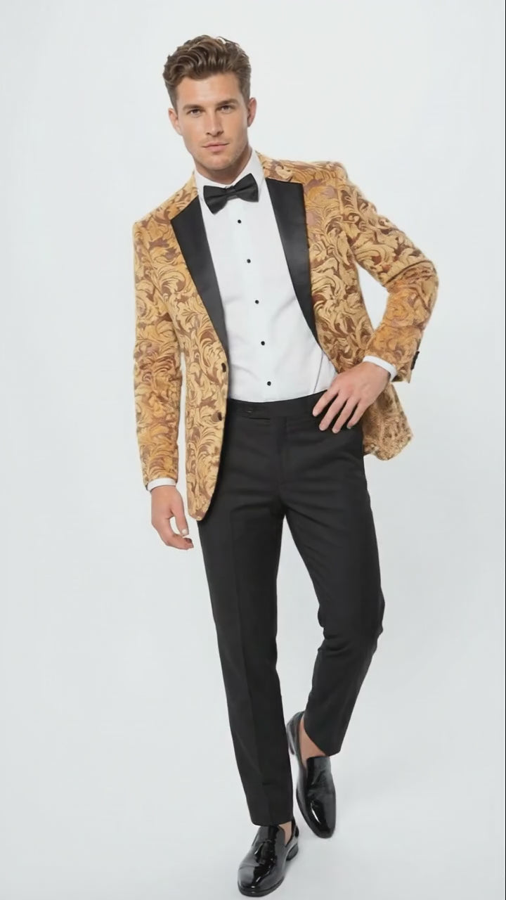 Mens Yellow Gold Baroque Pattern Tuxedo Blazer Suit Party and Wedding Jacket Prom Paisley Black Pants