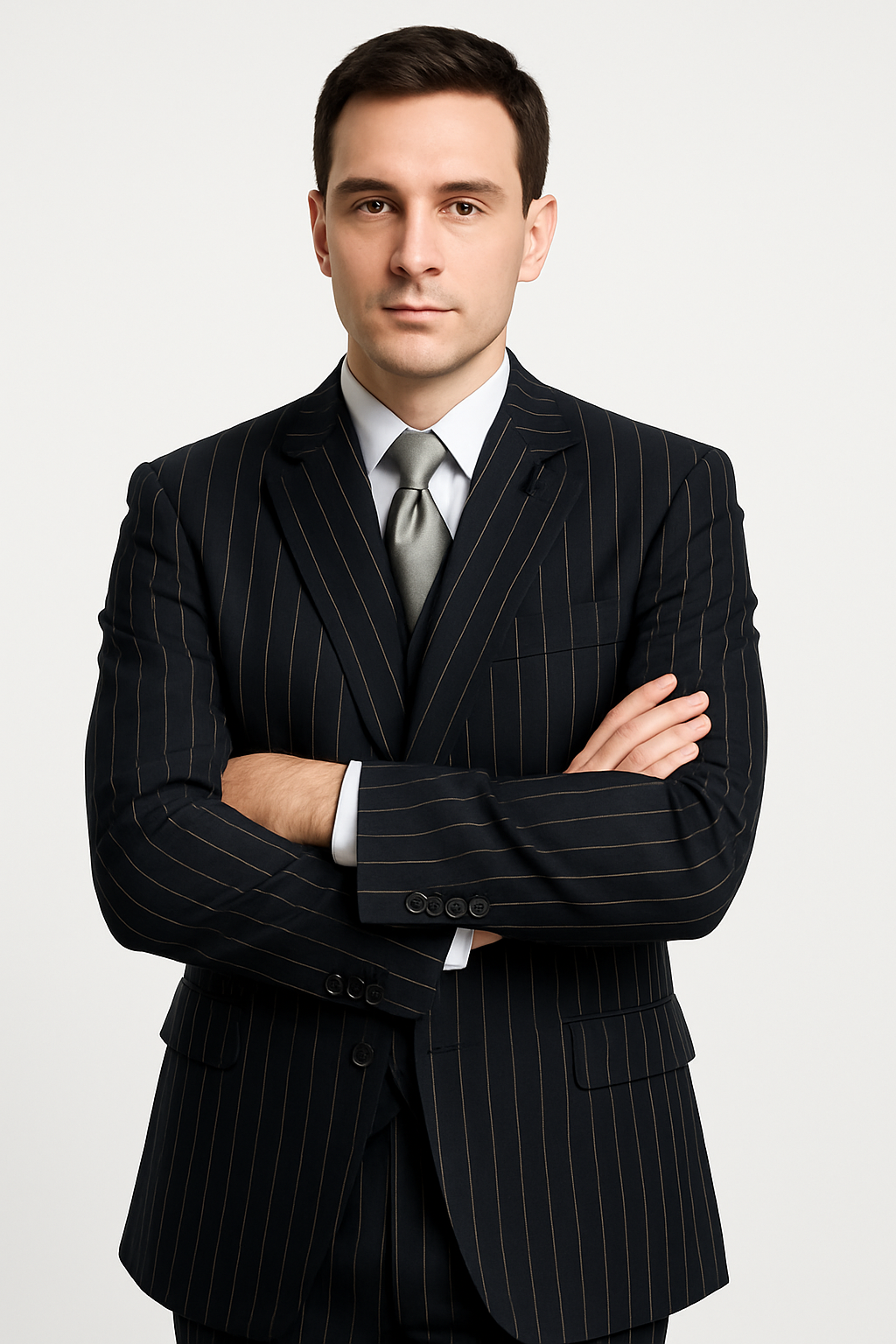 This 2 button classic fit suit comes with bold pinstripes, a notch lapel, and side vents. Comes with matching vest and pants.
