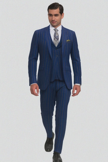 This 2 button classic fit suit comes with bold pinstripes, a notch lapel, and side vents. Comes with matching vest and pants.
