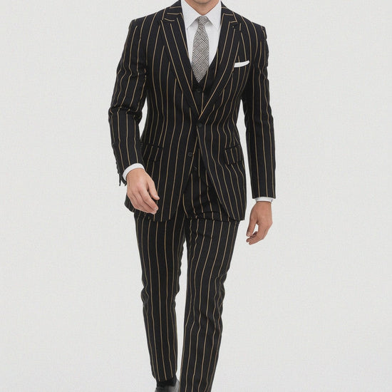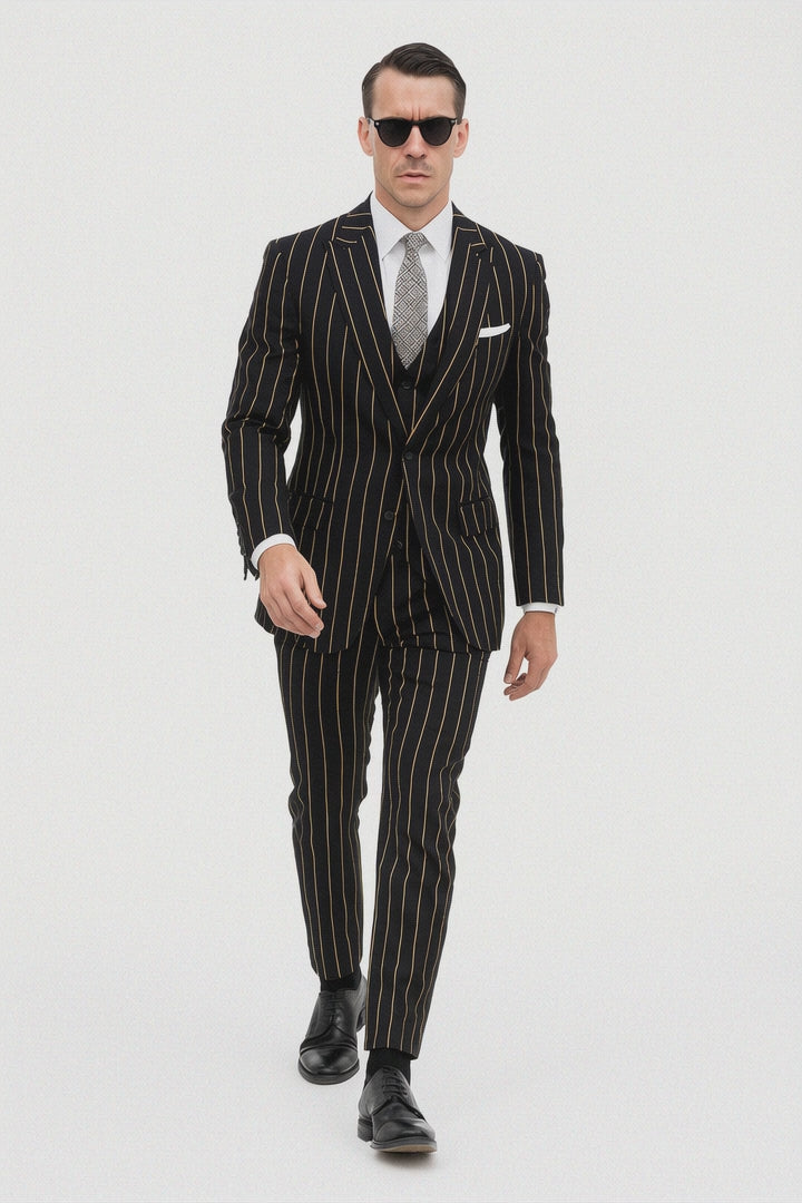 This bold gangster pinstripe suit is perfect for any 1920's or 1930's party, or any swing dance or dancing event, or to match a flapper outfit. The suit comes in a classic fit, with a bold white pinstripe, a 2 button closure, side vents, and matching vest and pants. Pants come 6 inches smaller than jacket size and can be let out 2 inches or taken in 4 inches. Thought this works great as a costume, it is definitely made to the same quality standards as all of our regular suits and tuxedos.