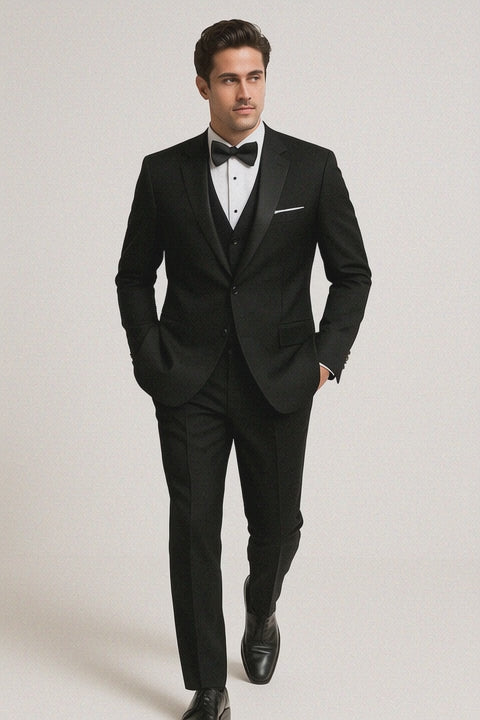 Accessories elevate the already sophisticated aesthetic of this three-piece tuxedo. A black satin or silk bow tie works best for black-tie events, while a muted solid-color necktie—in shades like charcoal or deep burgundy—can add personality for slightly less formal occasions. Include a white pocket square for contrast, choosing a straight fold for a traditional look or a puff fold for added texture. Cufflinks are essential for that final touch of luxury; opt for designs in silver, gunmetal, or subtle enamel for a professional, understated effect. A classic wristwatch with a slim profile and a leather or stainless-steel strap complements the tuxedo’s refined aesthetic without overwhelming it.