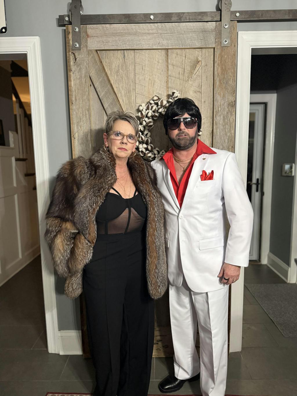 - Bold Red Dress Shirt: A sharp contrast to the white suit, the vibrant red shirt adds a dramatic flair, completing the signature Scarface-inspired look.